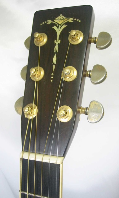 状態は当時のグローバー製ペグのゴールドメッキが少し曇っておりますが機能的にも問題はありません。トップにフレンチラッカーポリシュの日焼け斑が見る角度で僅かに見られ、トップのブリッジ下辺りに軽い打痕と光に翳さないと分からないレベルの小さな打痕程度で、年代から考えれば綺麗なコンディションを保っております。サイド&バックも軽い擦り傷ぐらいで目立つ酷いダメージはありません。まあた年代なりのバインディングの黄ばみが有りますが剥がれなどもありません。その他クラックなどの木部の割れや修復歴は見受けられません。ネック裏はVシェープのグリップの先端にカポを取り付け跡が細かく見られますが酷い感じでは無く気にならないレベルだと思います。またこの年代有る白濁がネックヒール辺りに見られます。フレットは9分目程度は残っており高さもあります。またネックヒールのピン打やピックアップの取付けは有りません。ネック・グリップはVシェープで、弦長約632,5mm、ナット巾約43mm、弦高は12F6弦で約2.5mm、1弦約2mmの標準的でサドルの余裕も約3mm有り、本ギターはMartin社でも採用されているSQネックですが、元起や反りも見受けられず、ネックを含めプレイヤビリティも良好です。当時のオリジナルMartinレプリカケースも付属しています。中古市場でも滅多に出ないレア・モデルで、お探しの方は是非この機会にご検討を頂ければ幸いです。