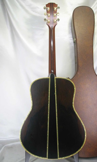 サウンドはノンスキャロップドXブレイシングが採用され、この年代にしか出せない重厚で野太い箱鳴りする低域と輪郭の際立った粒立ちの良い中域の音抜けも抜群で、『ドンシャリ~ン』と響く煌びやかで艶やかな倍音豊かな高音域も魅力です。強めのストロークでは反応の良い湧き上がる爆音が轟きます。状態はグローバーペグのメッキの劣化は見受けられえますが機能的にも問題がありません。トップのピックガード1弦側に光に翳して分かる塗装上のクラッチ傷とブリッジ下辺りに打痕が見られますが、既に生産から半世紀を迎えるギターとしては、パッと見た感じ日焼けも少なく年代を考えれば美品コンディションを保っております。サイドは軽微な擦り傷程度で、バックもセンター上部に打痕が見られますが、その他は軽い擦り傷が見られるぐらいで木部のクラックや割れの修復歴も見受けられません。ネックもナット裏と7F裏に軽い打痕ぐらいで綺麗で演奏性も良くフレットもオリジナルで8分目は残っていると思います。またネックヒールのピン打ちやピックアップの取付履歴は有りません。ただ14Fにファーストオーナーのネームインレイが装飾されています。ネーム削除も当店でお受け出来ますのでお気軽にお問い合わせ下さいませ。弦長651mm、ナット幅約44mm、弦高も12F6弦約2.4mm、1弦約1.8mm、サドルの余裕も約3mm有り元起や反りも問題なくネックを含めプレイヤビリティは良好です。また大変稀少なオリジナル・70年代初期のブラウン・ハードケースも付属しております。近年益々入手が困難で価格高騰が続いており、本器はLシリーズカスタム・四天王の3仕様が盛り込まれた稀少なオーダーモデルです。是非この機会にご検討を頂ければ幸いです。