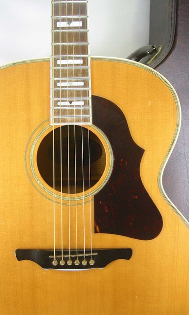 状態は、ペグは交換され金属劣化も無く輝いております。ナット&サドル&ブリッジピンはブラス製に交換、トップは塗装上の軽い打コンが右ショルダー辺りと6弦側ウエスト辺りとボディ下辺りの見られ、左ショルダー付近の塗装のウェザーチェッキングが見られますが表面的で良く見ないとわからないレベルで、その他は酷く目立つダメージではありません。サイド&バックは小さな打コンと擦り傷ぐらいで綺麗なコンディションを保っております。バックのネックヒール下に新品時に装着されていたストラップピンの穴埋めがありますがお好みでストラップピンを装着すれば問題はないと思います。ピックアップの取り付けや履歴はありません。ナット幅約43mm、弦高は12F6弦約2.5mm、1弦約2mmで弦高も適正でネックを含めプレイヤビリティも良好です。頑丈な内部カバーも付いたハードケース付きです。品番どり当時10万円の高級モデルです。ギブソンとギルドを上手くマッチングさせたルックスも魅力の希少モデルです。是非ご検討を頂ければ幸いです。