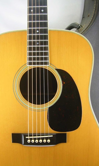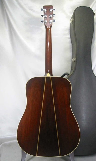 状態は全体的に驚くほど綺麗なコンディションを保っており、ペグの曇りも見受けられず、ヘッドトップに薄くオーバーラッカーされた可能性が有りますがヘッド周りも殆ど打痕や傷も見受けらずとても綺麗です。トップも素晴らしく綺麗で僅かにピックガードとサウンドホール脇にスクラッチ傷により塗装が薄くなっている箇所ぐらいで、傷や打痕は殆ど見られず目を凝らして光の翳してやっと分かるぐらいのダメージは有るとは思いますが、その他は年代相応のウェザーチェッキングが薄く見受けられるぐらいでオリジナル塗装の艶もあります。サイドも黒い縞いりのハカランダの杢目も美しくオリジナル塗装の艶もあり近年物の中古ギターレベルの綺麗さです。バックもバックル傷なども見受けられず素晴らしく綺麗で過去にオーバーラッカーされた可能性は有りますが、違和感も無く木部のクラックや割れの修復歴も見受けられません。ヴィンテージギターあるあるのハカランダ材の曇りの拭き取りを防ぐためにされた可能性は有りますが、全体を見てもオリジナルと言われても違和感が無くとても綺麗です。ナット&サドルも交換済みで、フレットも交換されており殆ど減っておらず、指板の消耗も殆ど見られません。オリジナルピックガードの僅かな収縮が見られ、ヴィンテージ・マーティンで見られるピックガード脇のマーティン・クラックですが、表板的にもクラックも見受けられませんが、経年のクラック防止のため内部からクリーク処理がされていて今後もリペアの必要はありません。。ブリッジはエボニー材で交換済みです。その他ボディやネックなどの割れやクラック修復歴は見受けられません。またネックヒールのピン打ちやピックアップの取り付けもありません。ナット幅約43mm、弦高も12F6弦約2.5mm、1弦約2mm、サドルの余裕も約2.5mm程あり微調整は可能で若干ネックの反りは見られますが弦高も標準の許容範囲で音詰まりやビビりなど見られずネックを含めプレイヤビリティも良好です。オリジナルのスネークヘッドのハードケースも付属しており、綺麗なグリーン色の内部と留金4個も問題が無く締まります。中古市場でも玉数が少なくコンディションの良い個体が激減しており、ご存知の通りヴィンテージのハカランダ仕様な年々価格が高騰しております。本器は鼈甲柄ピックガードやT-バーロッドの最終年度の稀少モデルです。是非この機会にお試しを頂ければ幸いです。