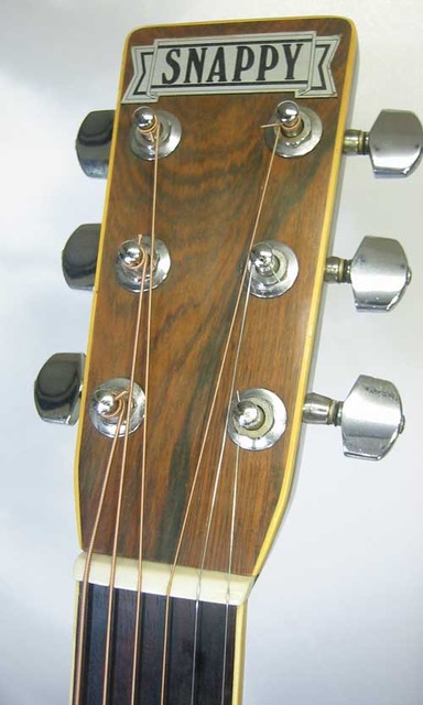 Cat's Eyesのセカンド・ブランド、Snappy by Cat's Eyes SW-800入荷です! プリウォーD-28のレプリカ・モデルで、ヘッドにはハカランダの化粧板が使用され、クルーソンタイプのペグ、塗込みブラック・ピックガード、ヘリンボーントリム、キャッツアイ・ポジションマーク、トップはスプルース単板、サイド&バックには物凄い板目のハカランダ材が使用されています。ボディ内部のインナーラベルはSnappy SW-800ですが、ネックブロックにはW-800とシリアルが刻印されています。多分B級のセカンドラインの輸出モデルだと思います。またヘッドのSnappyのロゴプレートを剥がすとCat's Eyesロゴが出てくると思いますが当店では剥がす勇気がありません。出てこなかったたら御免なさい。