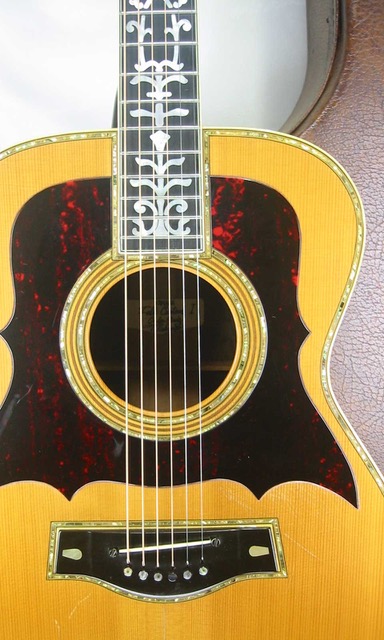 希少なオーダーメイド・モデル、YAMAHA Fork Custom 1 の入荷です!1974年ラグジュアリーLuxury (豪華/高級品)に由来するL-シリーズが誕生しました。本器は試作かプロト・モデルだと推察します。当店でもL-53等のフォークカスタムIIIなどの試作モデルを取り扱いをさせて頂きましたが、YAMAHA L-51 CTMの試作モデルは初入荷です。また驚いたのが他店で瓜二つのモデルが存在していたことです。トップはスプルース単板、サイドは板目杢の高級ハカランダ単板、バックはハカランダ/メイプル/ハカランダの3ピース単板で、 FG-2000やFG-1500で見られる仕様で、ボディは左右非対称のL-51ボディ・デザインが採用されており、ヘッドはL-52,音叉ロゴ、ペグはポスト先端がマイナス(➖)の初期TM-50G、ネックはオリジナル L-51と同じマホガニー材が採用され積層ネックではありません。指板&ブリッジは漆黒のエボニー、白蝶貝の指板インレイ&ブリッジ・インレイとブリッジ周りにもアバロン装飾が施されております。ボディのアバロン・トリムやサウンドホール・ロゼッタにはL-31と同じ極太のアバロン装飾が施されており、ブリッジはL-12でお馴染みのアジャスタブル・ブリッジが採用されております。また良く見ると一枚物のベッコウ柄ピックガードも左右非対称でデザインされおり驚きました。ボディのインナー革ラベルには手書きで『Fork Custom 1Order Made T.Nakamoto』と有り製造年の記載はありません。テリー中本氏がご存命であれば誕生秘話でもお聞き出来たかもしれませんが残念です。