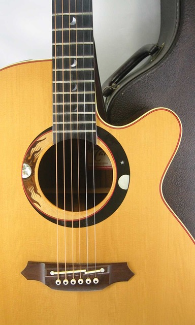 1997年の学期フェアで発表され翌年1998年に限定販売されたリミテッド・モデル、TAKAMINE LTD-98 Limited Modelの入荷です!1998年に限定250本製作された希少モデルで、世界で初めてギターにデジタル・プリアンプ『Acoustic DSP PRE-AMP AD-1を搭載し、10プリセット+10ユーザーピログラムの20種類のサウンドを設定し瞬時に呼び出す事のできる優れものです!ハウリング対策として音名を指定して効果の強さを設定するだけでフィードバックを押さえられるフィードバック・アブソーバーも搭載。他にもダーク/ブライトのデジタルロバーブ、オートクロマティックチューナー等、多彩な機能も魅力です。トップはスプルース単板、サイド&バックにはエキゾチックなハカランダ材の代替え用としても使用されたリオ・グランデ・パリサンドルが使用され、500AD-1プリアンプをシリーズボディーにヴェネチアン・カッタウェイ、ネックはマホガにー、ローズ指板&ブリッジ、セパレート・サドル、またレーザー加工した最先端の技術により月の満ち欠けをイメージしたインレイやロゼッタの宇宙をイメージした象嵌など限定モデルに相応しい仕上がりです。